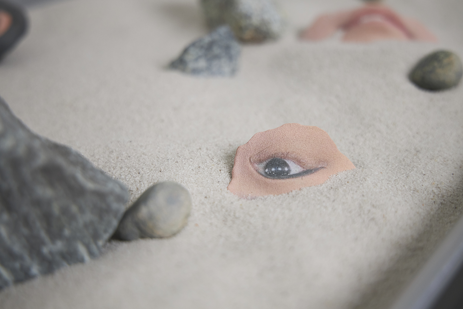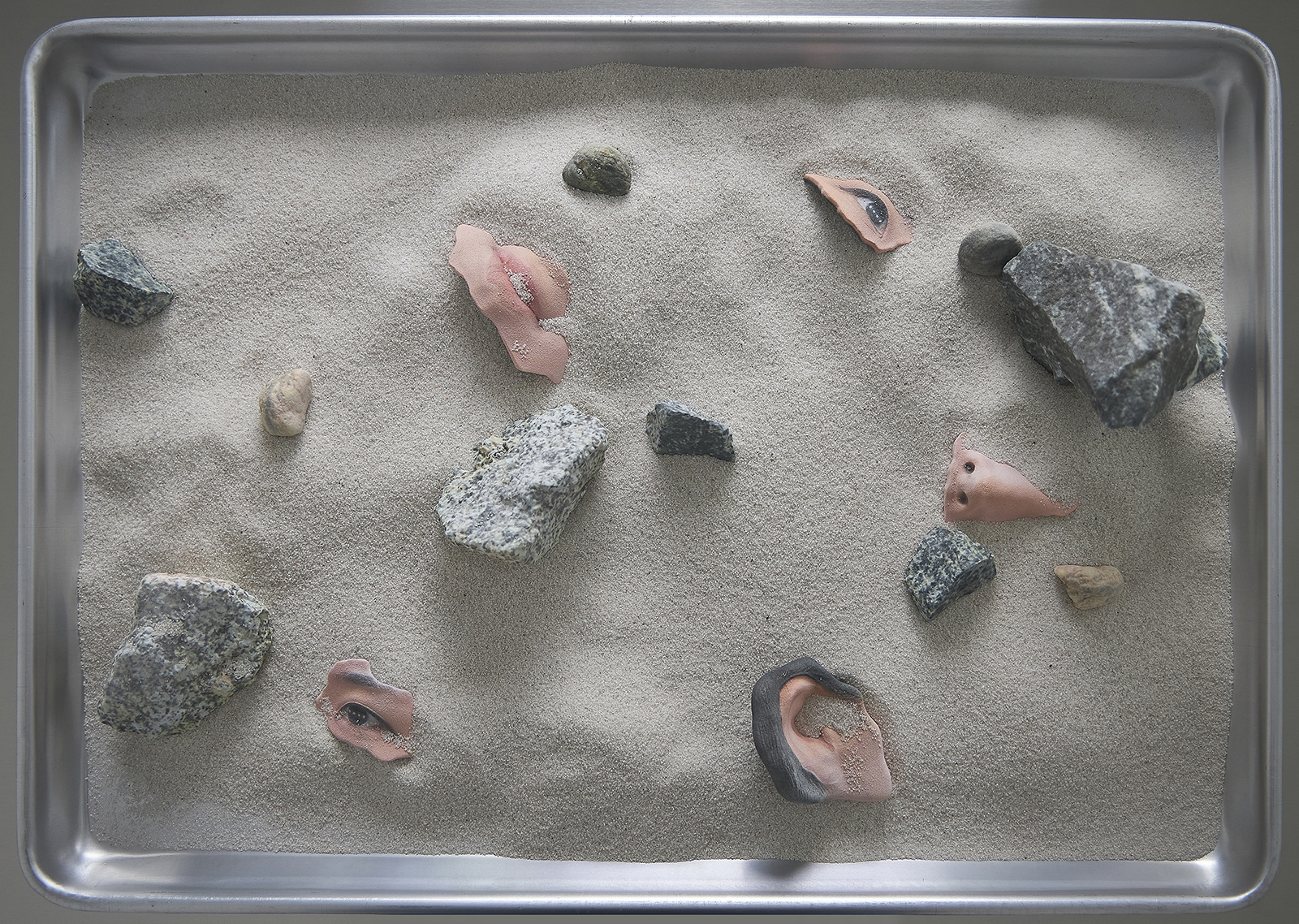 3-D printed nylon, sand, stainless steel shelving table, aluminum trays